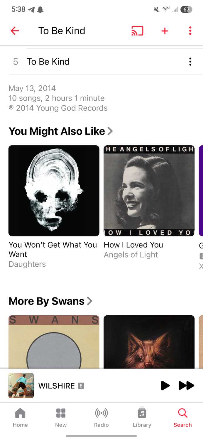 Apple Music, though, seems to offer exactly what YouTube Music is bringing here. Pulling up the exact same Swans album, I fully expected to see Daughters You Won't Get What You Want — the first recommendation, naturally — along with albums from Xiu Xiu, Death Grips, and another appearance from 'Allelujah! Don't Bend! Ascend!. All feel pretty fitting for fans of Swans (or, frankly, Anthony Fantano's YouTube channel).