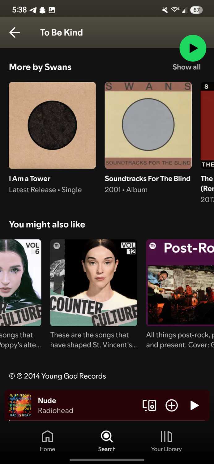 As spotted by Reddit user u/yperfysikos, YouTube Music has a new "Recommended" section in the works for its album pages (via Android Authority). Rather than displaying simple copyright notices or alternate versions of albums at the bottom of any given album tracklist, this Reddit user noticed a new carousel of similar LPs worth diving into. In the screenshot shared, for example, Swans' landmark To Be Kind included suggestions for the band's most recent album The Beggar, as well as Godspeed You! Black Emperor's 2012 release 'Allelujah! Don't Bend! Ascend! — both of which, to my ear, are solid recommendations.